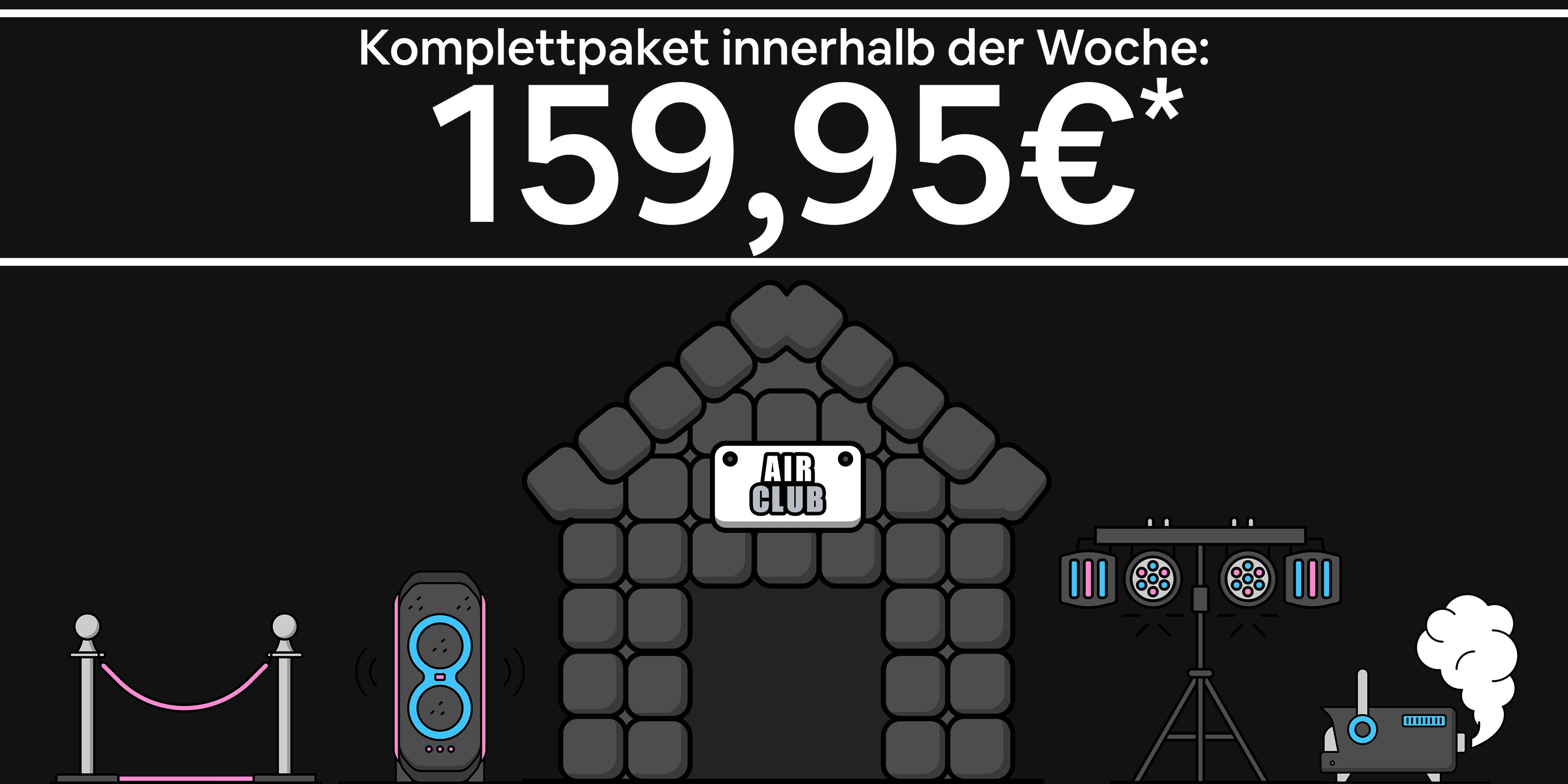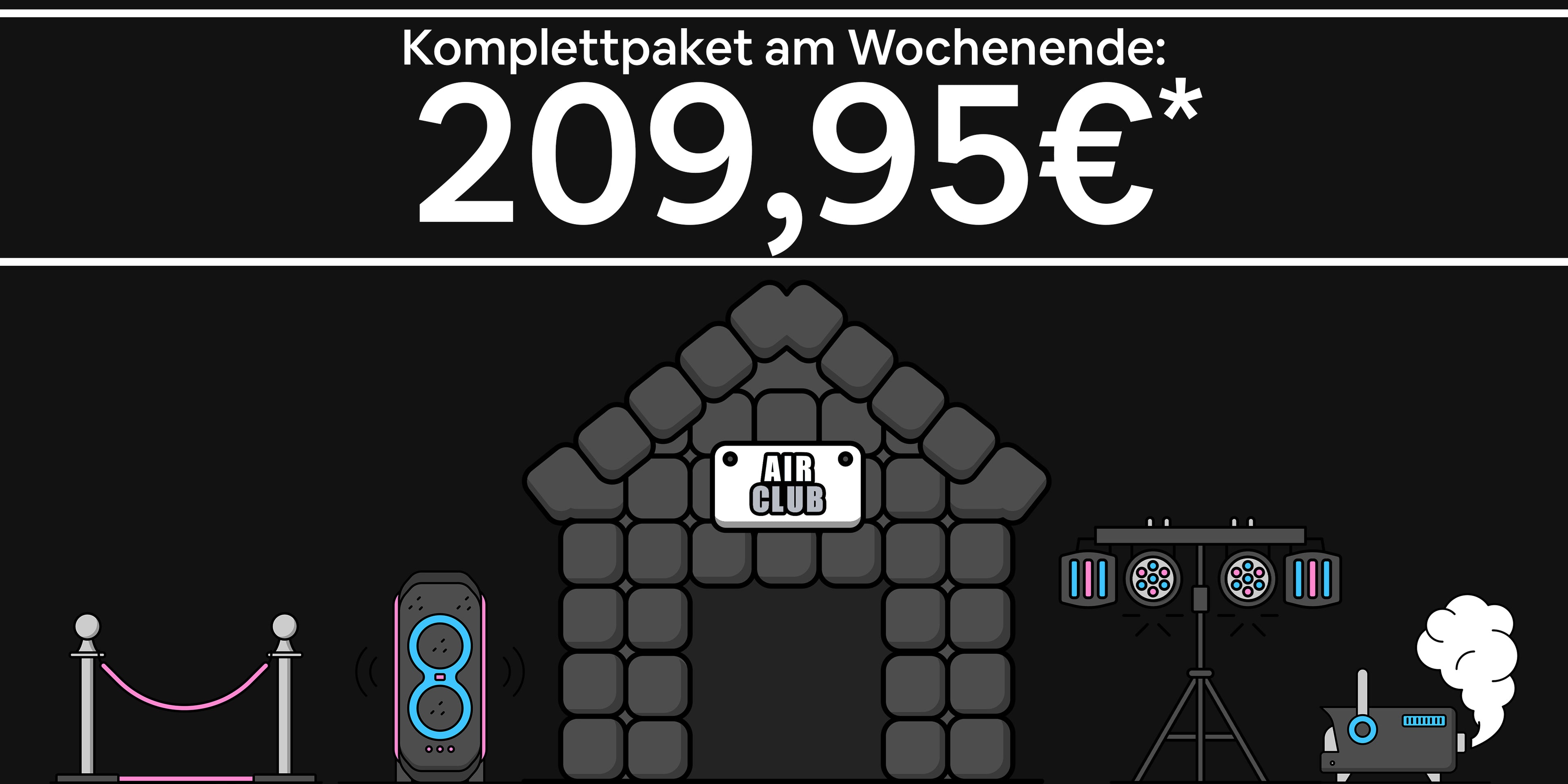 Komplettpaket: Airclub, JBL 710, Lichtset, Nebelmaschine und Absperrpfosten mit rotem Teppich
